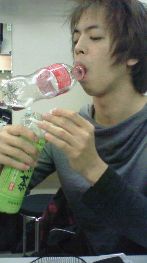 楽屋入りしました。写真はコーラを既に飲み干しているのに更にお茶を飲もうとする中川くん。